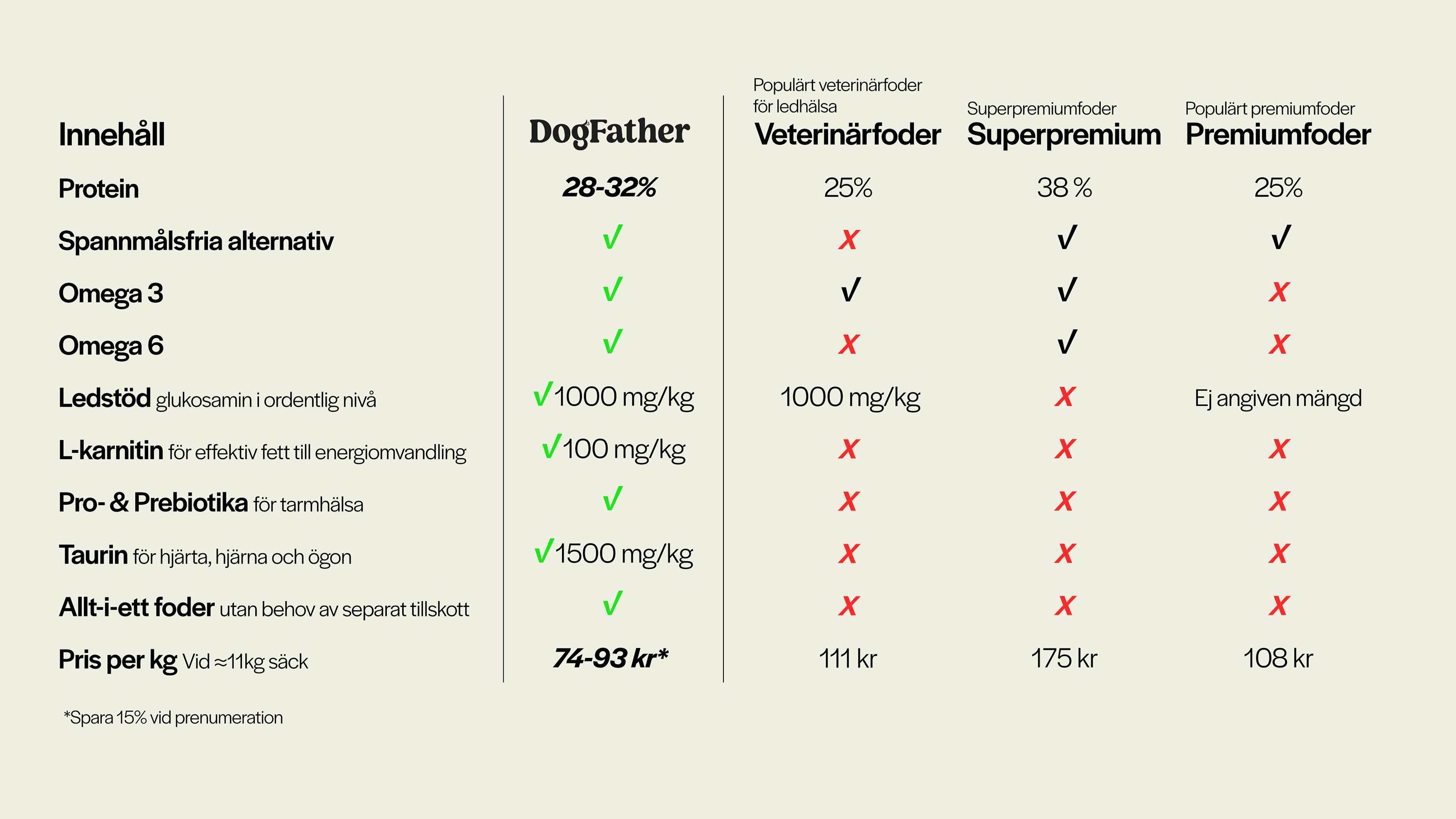 Dogfather skapades för att lösa detta från grunden. Ett foder där funktionella nivåer av glukosamin, taurin, omega 3 & 6 samt pro- och prebiotika redan ingår, så att du slipper gissa, komplettera och kompromissa.